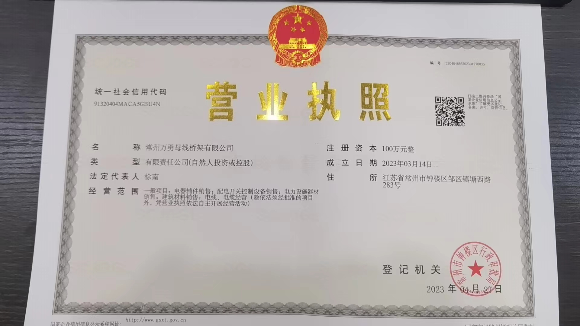 常州万勇母线营业执照